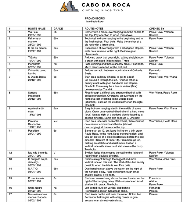 Lobo Mau and Promontório are two of the finest sectors at Cabo da Roca, offering high-quality trad routes on solid rock with excellent protection opportunities. Maminhas sector, being ocassionaly washed by waves, boasts impecable clean rock with fun cracks and also two roof cracks. Baia das caixas, by contrast sits high above the shore line almost on the top of the cliff and it composed of some moderate routes.